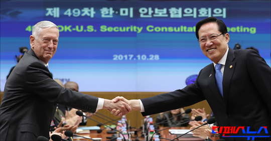아울러, 북한의 비핵화 달성을 위한 한미 양국의 외교적인 노력을 굳건한 한미연합방위태세로 강력하게 뒷받침해 나가기로 하였습니다. 또한, 미국의 확장억제 공약의 실행력을 제고하기 위해 미 전략자산의 순환배치를 확대하고, 다양한 억제방안에 대해서 협력을 강화해 나가기로 했습니다. 또한, 한미 양국은 우리 군의 방위역량 확충을 위해서 미사일 지침 개정과 최첨단 군사자산 획득·개발을 위해 긴밀히 협의해 나가기로 하였습니다. 매티스 장관과 본인은 조건과 시기를 고려하여 전작권 전환이 조속히 가능하도록 내년 SCM까지 전환계획을 공동으로 보완·발전시키기로 하였습니다.